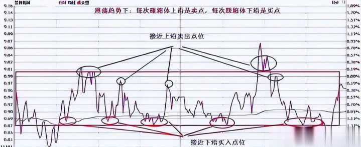 1、震荡趋势下:每次碰箱体上沿是卖点,每次踩箱体下沿是买点。