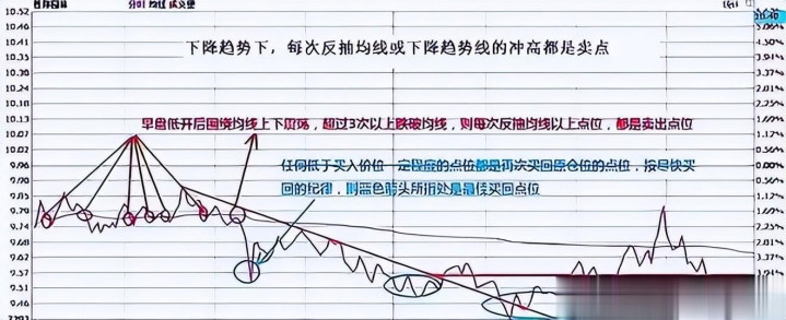 2、下降趋势下,每次反抽均线或下降趋势线的冲高都是卖点。